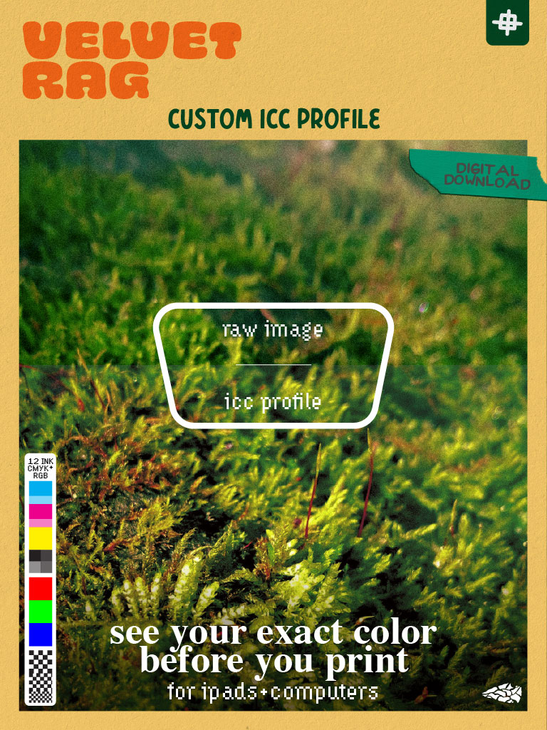 Free yourself from color accuracy anxiety! Use these icc profiles to our Velvet Rag Giclée art print paper all from behind your screen! Saving your time & money all while skipping the waiting to find out if your work looks good. [which it always does]